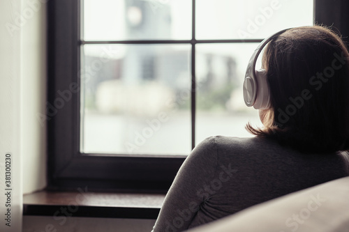 Back view of lonely brunette woman in headphones listen music sitting near window . Concept