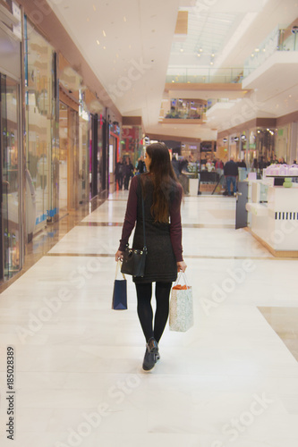 Back view of pretty girl walking in the shopping mall with shopping bags, watching to display windows of shops and stores