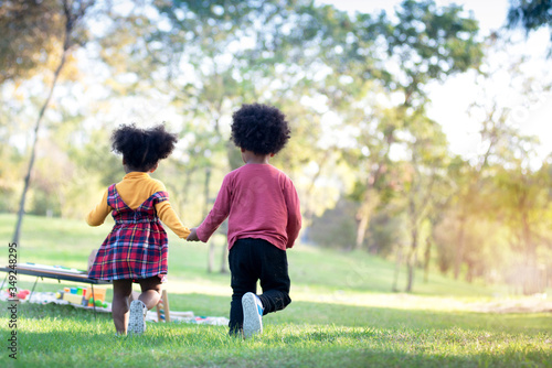 Back view of two dark-skinned kids holding hand and walking together in the garden