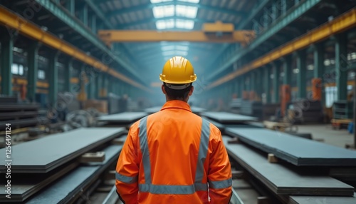 Back view of worker in orange reflective jacket, safety helmet stands inside steel factory with metal sheets, industrial machinery in large manufacturing plant. Industry expert control production,