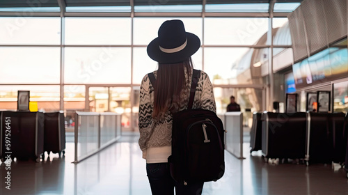 Back view of young traveller woman with suitcase standing in airport terminal. Generative AI
