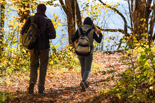 Back view two hikers walking in autumn forest