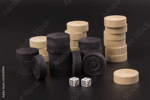 Backgammon. Board game. White dice and white and black chips for playing on a black background. Game for recreation