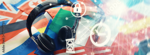 Background concept polyglot. Headphones and flag. The study of foreign subjects. Audiobooks in a foreign language.