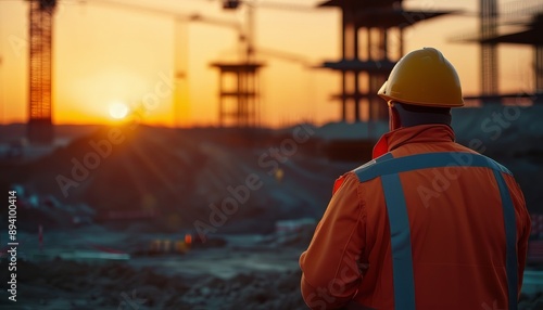 Background of a worker inspecting a project at a construction site Building Site at Sunset