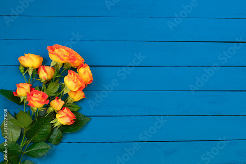 Background of bouquet of beautiful fresh vivid orange roses tinged with red for celebrating an anniversary, birthday or Mothers Day