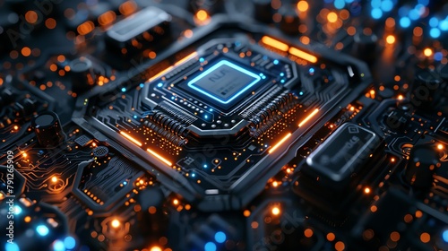 background of dark chip floor with a futuristic technological feel, with a huge and exquisite chip metal frame on top and blue light particles below