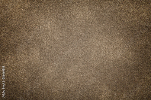 Background of light bronze suede fabric closeup. Velvet matt texture of brown nubuck textile