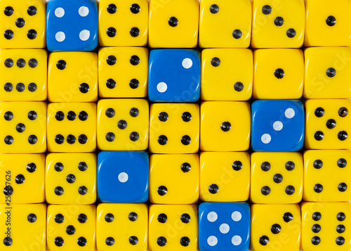 Background of random ordered yellow dices with five blue cubes