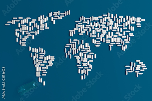 Background of scattered on a plain blue background of many tablets in the form of a silhouette of the continents of the world 3d illustration