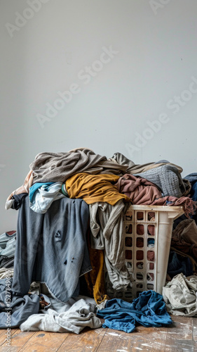 Background with colorful clothes piled in laundry basket. Useful in articles about home comfort, space organization, materials about laundry and cleaning.