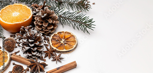 Background with natural elements, pine branches, pine cones, dried oranges, cinnamon sticks. Christmas break. Christmas holidays.