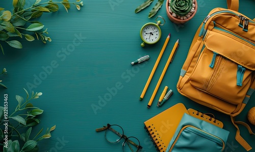 backpack with school stationery on green background back to school concept flat lay top view.