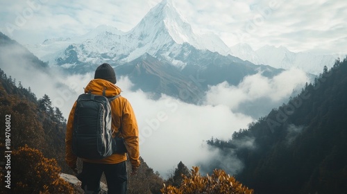 Backpacker Gazing at Majestic Snowy Mountain Peak