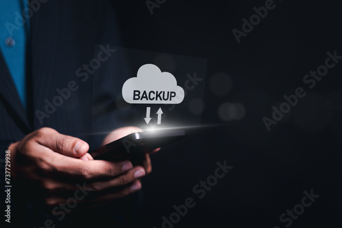Backup storage data technology concept. Backup online documentation database and digital file storage system or software,file access, doc sharing. Person use smartphone with virtual backup icons.