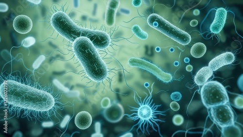 Bacteria and microorganisms observed through a microscopic lens in a laboratory setting