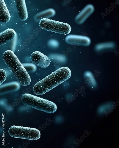 Bacteria exposure under a microscope concept. Microscopic view of bacteria, showcasing their rod-like shape and texture against a dark background