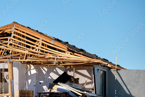 Badly damaged mobile home after hurricane Ian in Florida residential area. Consequences of natural disaster
