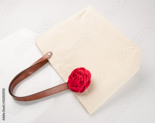 bag or shopping handbag with rose on background.