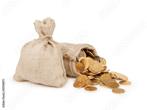 Bags filled with coins. A white background. Isolated.