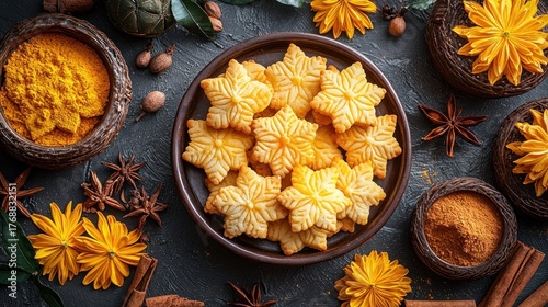 Baked snowflake cookies, spices, and flowers on dark surface