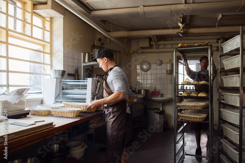 Bakers preparing dough in kitchen