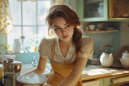 Baking in a cozy kitchen on a sunny afternoon, a young woman carefully measures sugar to create sweet treats with love and passion