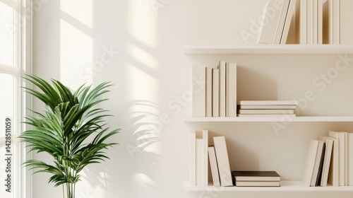 Balanced white shelving unit with neatly stacked books and a green plant, placed against a clean neutral wall