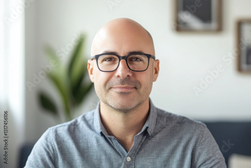 Bald Caucasian man wearing glasses in a modern office setting with natural light and plant decor.