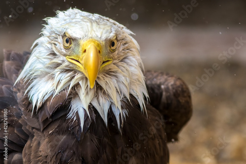 Bald eagle in close-up. Dynamic eagle face on to camera