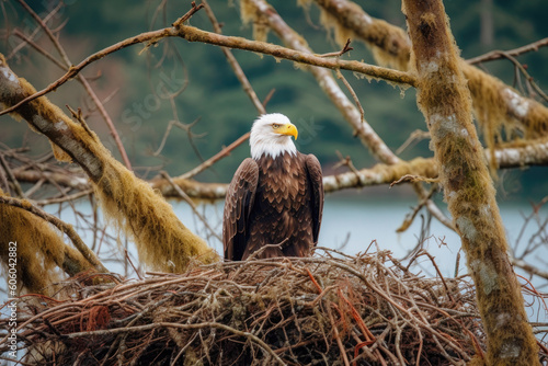 Bald Eagle Nesting in a Tree by a River - Generative AI