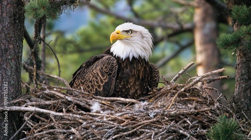 Bald Eagle perched in a large nest surrounded by trees, showcasing its striking white head and powerful physique in a natural setting.