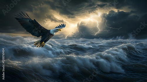 Bald Eagle Soaring Over Stormy Ocean Waves