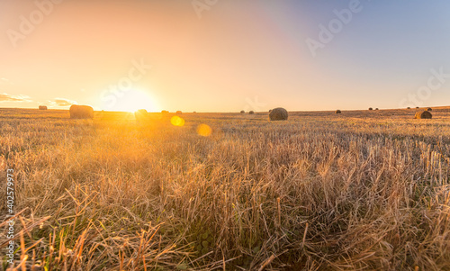 bales in the field at sunset