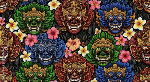 Balinese Barong masks and tropical flowers create a visually stunning and culturally rich seamless pattern perfect for exotic decor and apparel.