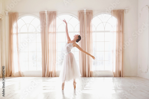 Ballerina dancing in a studio on white background window.
