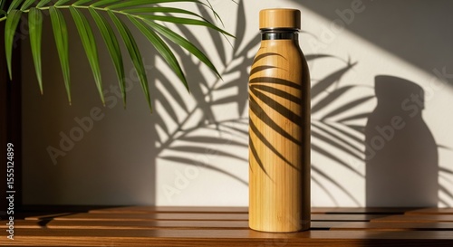 Bamboo reusable water bottle with plant leaf shadow on wooden table
