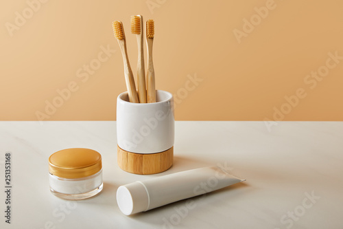bamboo toothbrushes in holder, toothpaste in tube and cosmetic cream on white table and beige background