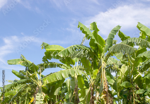 Banana tree plantation in nature garden with daylight blue sky