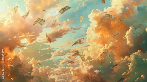 Banknotes float among golden-lit clouds inviting thought on wealth's nature