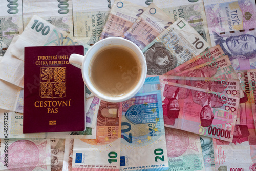 banknotes of different currencies with passport and coffee, czech euro IDR CZK PLN