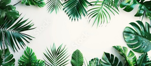 Banner design featuring a collection of tropical leaves set against a white backdrop.
