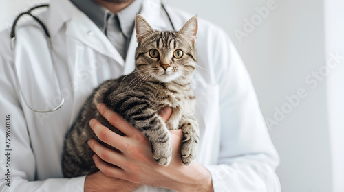 banner for veterinarian's day, a veterinarian in a white coat holds a cat in his arms, with space for text