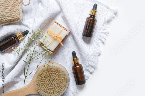 Banner Natural medicine, organic cosmetics, cosmetic product research, organic skin care products. Top view, flat lay. Skin care concept. Dermatology.