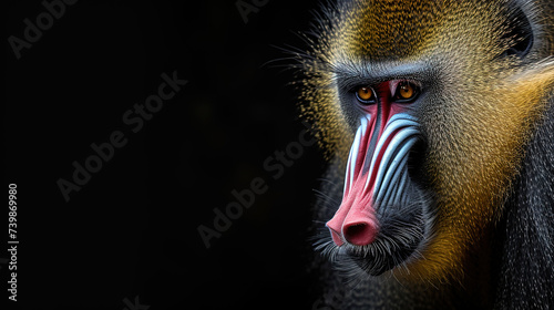 Banner of a mandrill on blured nature background, with empty copy space