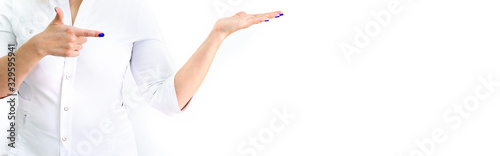 Banner with doctor's hands showing to the side. medical uniform. Cosmetology and medicine. Copy space. Isolated.