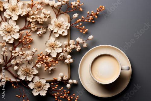 Banner with flowers with cup of coffee on grey background. Greeting card template for Wedding, mothers or woman day. Springtime composition. Flat lay style
