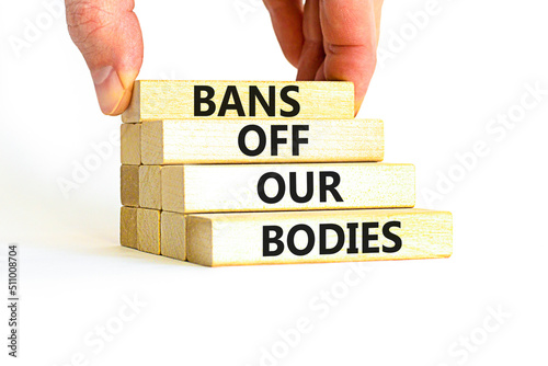 Bans off our bodies symbol. Concept words Bans off our bodies on wooden blocks on beautiful white table white background. Women rights concept. Business social issues and bans off our bodies concept.