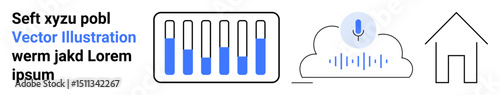 Bar chart, cloud with mic, and simple house outline showcasing data, audio cloud storage, and minimalism. Ideal for tech, analytics, cloud computing, home design innovation digital content simple