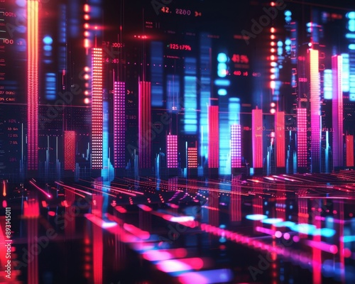 Bar chart, holographic data visualization, futuristic financial analysis, neon glow